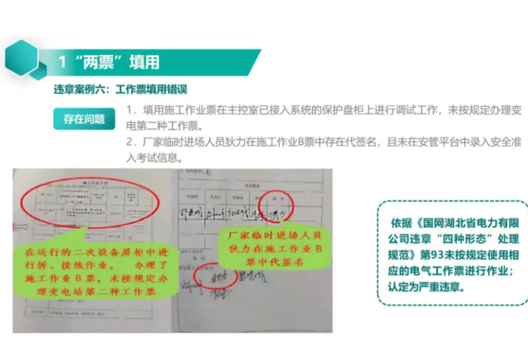 工作票(含分票、工作任务单、动火票等)票面缺少工作许可人、工作负责人、工作票签发人、工作班成员(含新增人员)等签字信息。票面线路名称(含同杆多回线路双重称号)、设备双重名称填写错误。票面防触电、防高坠、防倒(断)杆、防窒息等重要安全技术措施遗漏或错误。工作票延期、工作负责人变更等未在票面上准确记录。作业票缺少审核人、签发人、作业人员(含新增人员)等签字信息。
